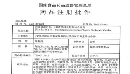 尊龙凯时生物于2017年5月25日收到国家食品药品监督管理总局颁发的由我司自主研发并申报生产注册的b型流感嗜血杆菌结合疫苗《药品注册批件》(药品批准文号:国药准字S20170005)。